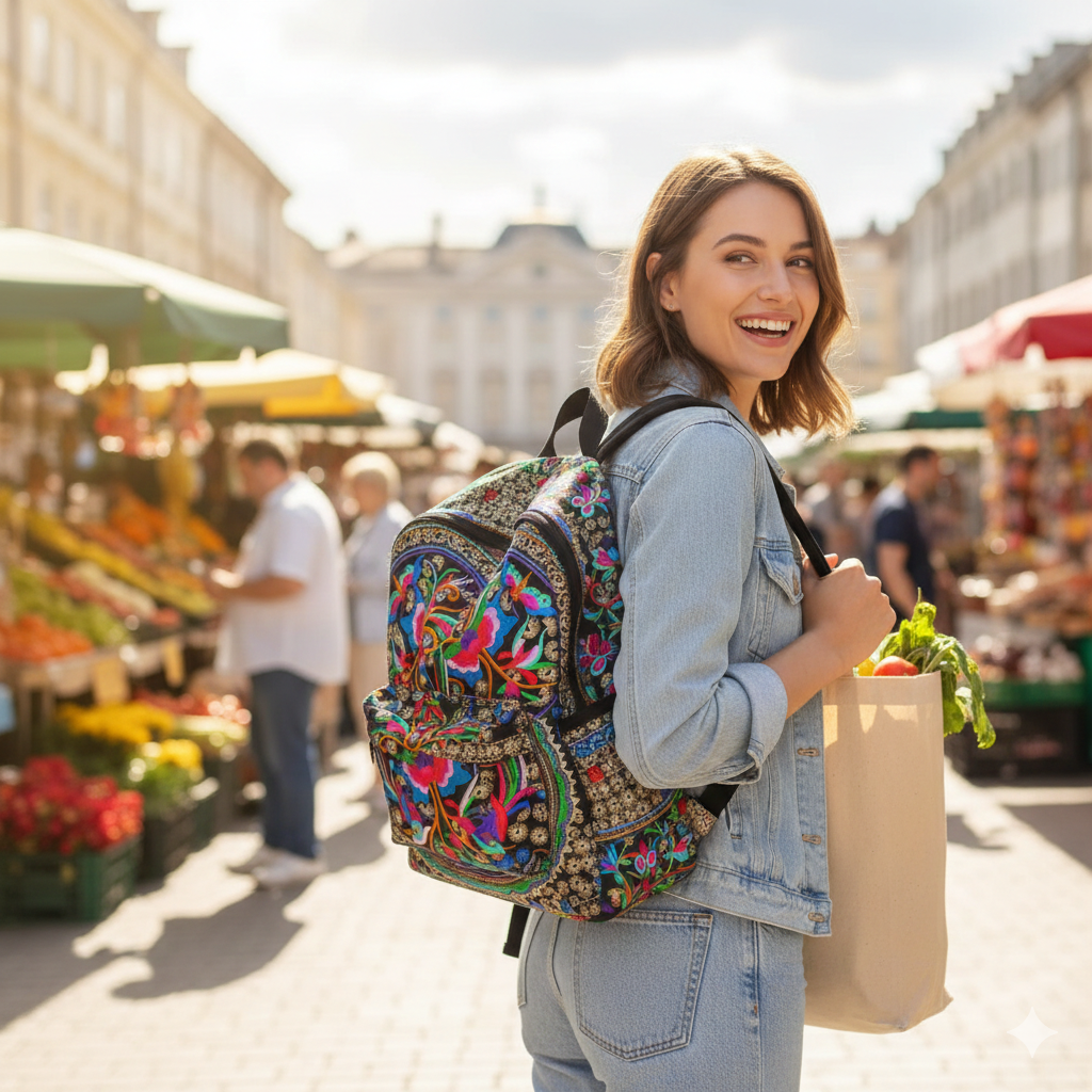 Met een ruim hoofdvak, meerdere opbergvakken en verstelbare schouderbanden biedt de Vintage Embroidered Backpack voldoende ruimte voor al je essentials — van boeken en laptop tot make-up, portemonnee en waterfles.