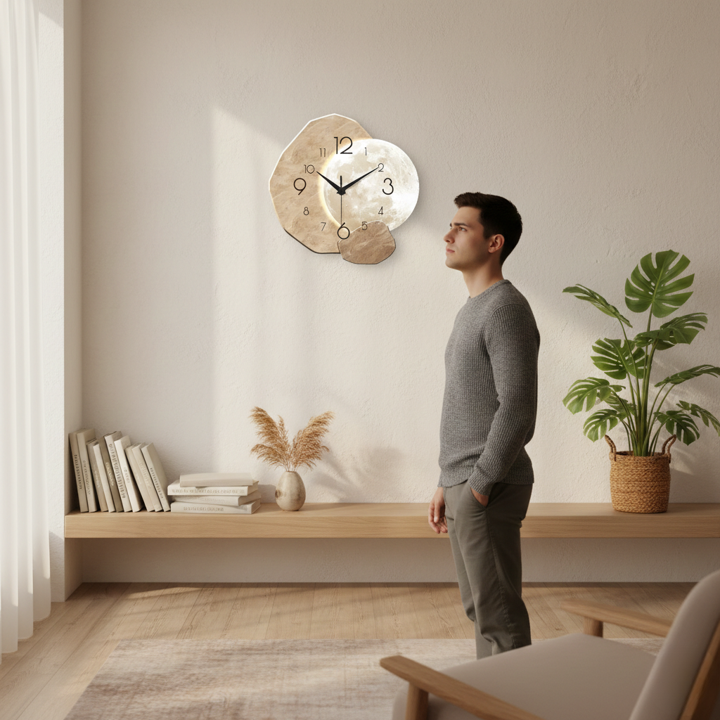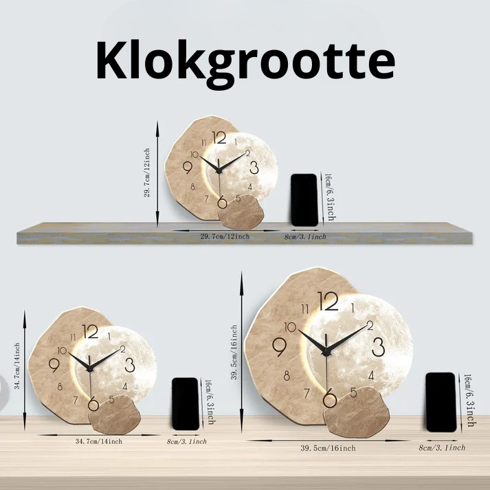 De klok is gemaakt van een hoogwaardige composiet met een textuur die de look en feel van natuursteen en het maanoppervlak nabootst.